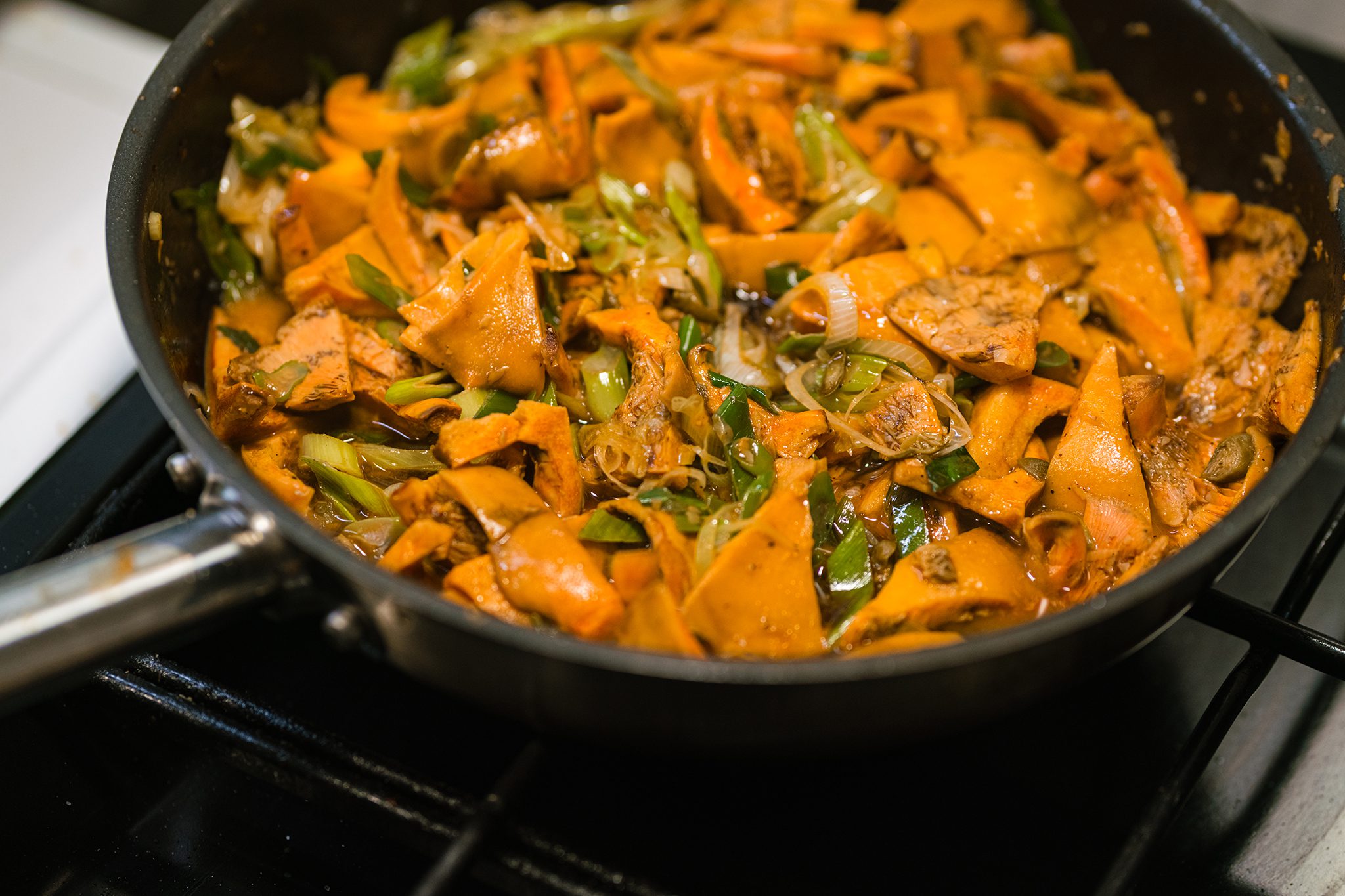 Az újhagymát vékony csíkokra vágjuk, majd a felhabzó vajon 2 percig pirítjuk. Hozzáadjuk a cikkekre vágott rizikét, és magas hőfokon további 3 percig pirítjuk.