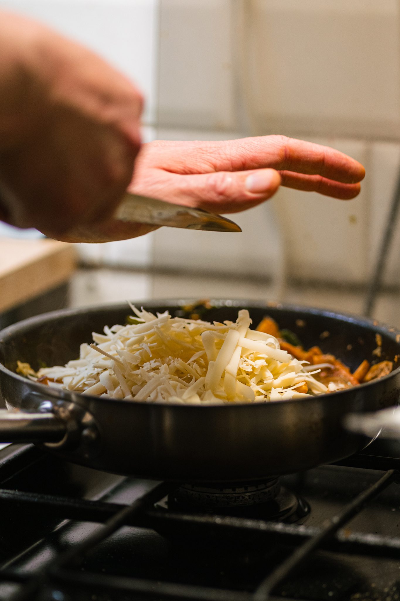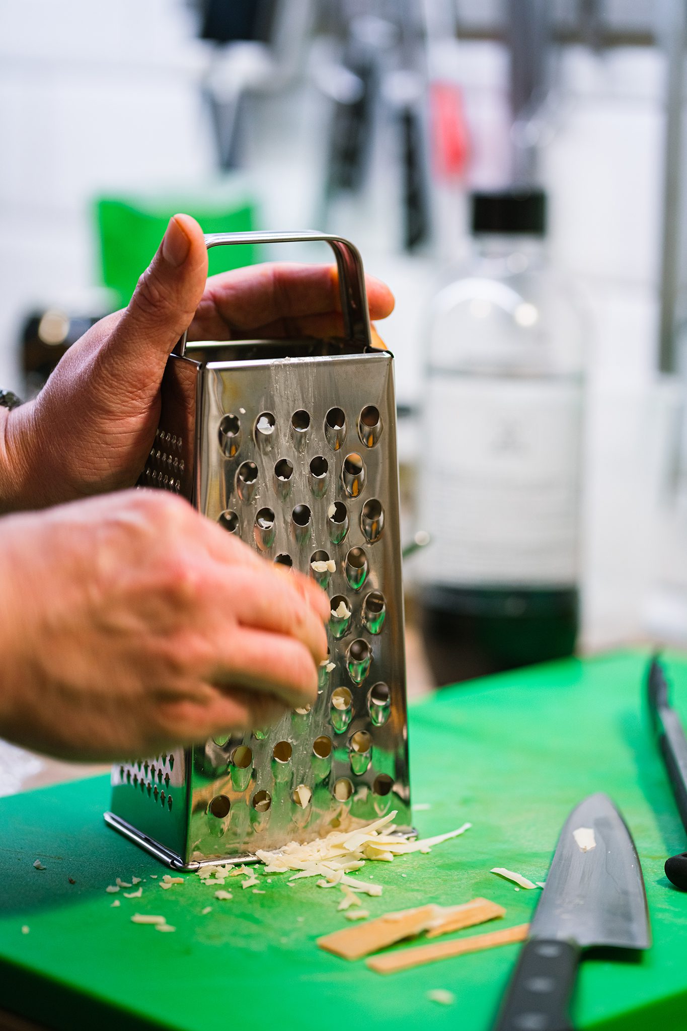 A lisztet elkeverjük a sóval és a porcukorral, majd a hideg vajat nagy lyukú reszelőn a lisztbe reszeljük. Gyors mozdulatokkal morzsás állagúra dolgozzuk, ügyelve arra, hogy a vaj végig hideg maradjon.