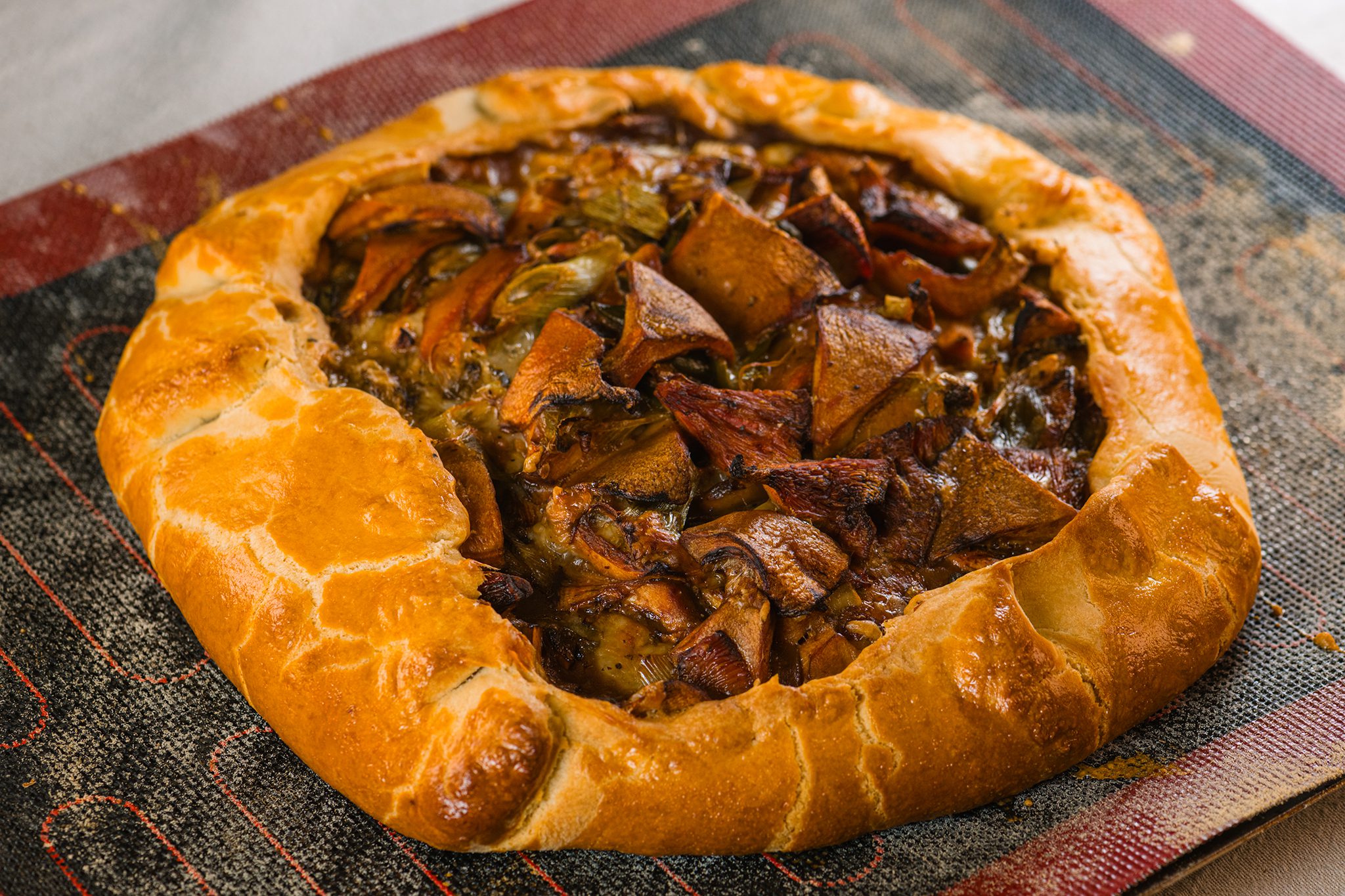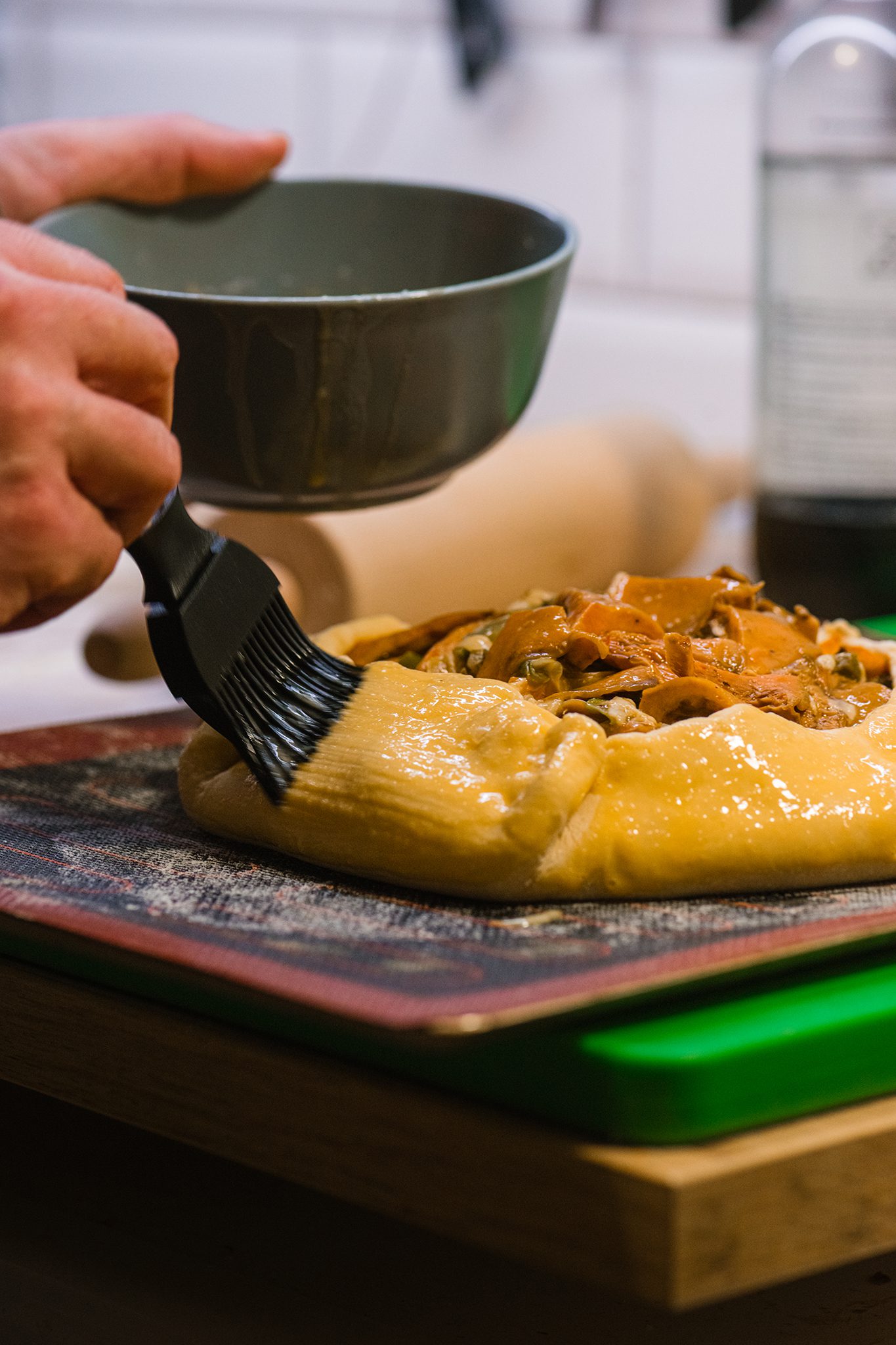 A tésztát enyhén lisztezett felületen kb. 5 mm vastag, nagy koronggá nyújtjuk. Sütőpapírral bélelt tepsire helyezzük. A tölteléket a tészta közepére halmozzuk, úgy, hogy a széleken bőségesen maradjon üres perem.