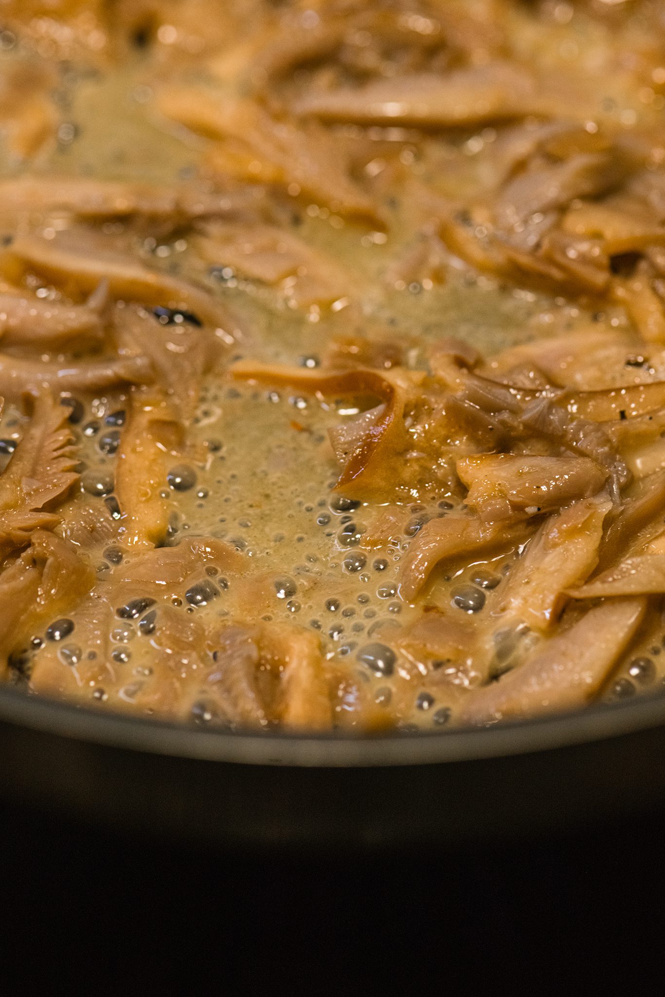 A pereszkét csíkokra vagy cikkekre vágjuk, majd a felhabzó vajon 2–3 percig pirítjuk.